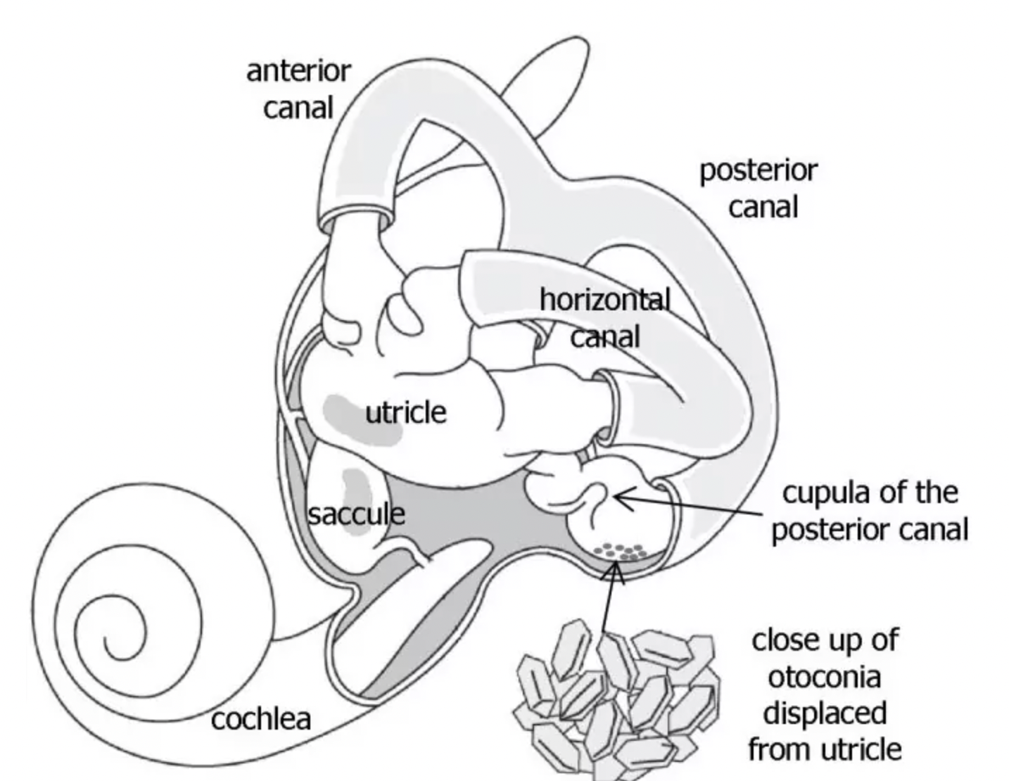BPPV is a mechanical problem that occurs in the inner ear. It involves the otoconia, which are calcium carbonate crystals, that are normally fixed in place within the gel of the utricle. The otoconia become dislodged and move into one of the semicircular canals (for example, the posterior canal, as pictured above). There are 3 semicircular canals in each inner ear and they each respond to specific head positions. When enough otoconia become displaced in a particular canal, the movement of the fluid within that canal changes and sends abnormal signals to the brain when the head moves into the orientation of the canal.
